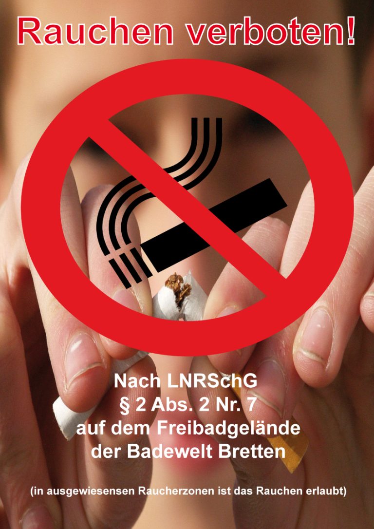 Rauchverbot bereits ab Saisonbeginn auf dem Gelände der Badewelt Bretten durch Hausrecht verfügt. Wir werden eine entsprechende Raucherzone auf dem Freibadgelände ausweisen, innerhalb dieser das Rauchen erlaubt sein wird. Wir sind leider gezwungen mögliche Verstöße als Ordnungswiedrigkeiten zu verfolgen.